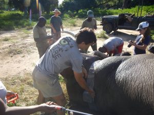 Durch eine Spende von Bushlife Safaris (https://www.bushlifesafaris.com/) wurde es AWARE ermöglicht, im berühmten Mana Pools Nationalpark „iconic bulls“ GPS-Senderhalsbänder anzulegen. „Boswell“, einer der „iconic bulls“ von Mana Pools, erhielt im April 2017 von AWARE als erster ein solches Senderhalsband.