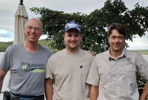 Tyler Wiggill (Mitte) eingerahmt von Martin Kessler (links, Vorsitzender AWARE Germany e.V.) und Dr. Keith Dutlow (rechts, Director AWARE Trust Zimbabwe)